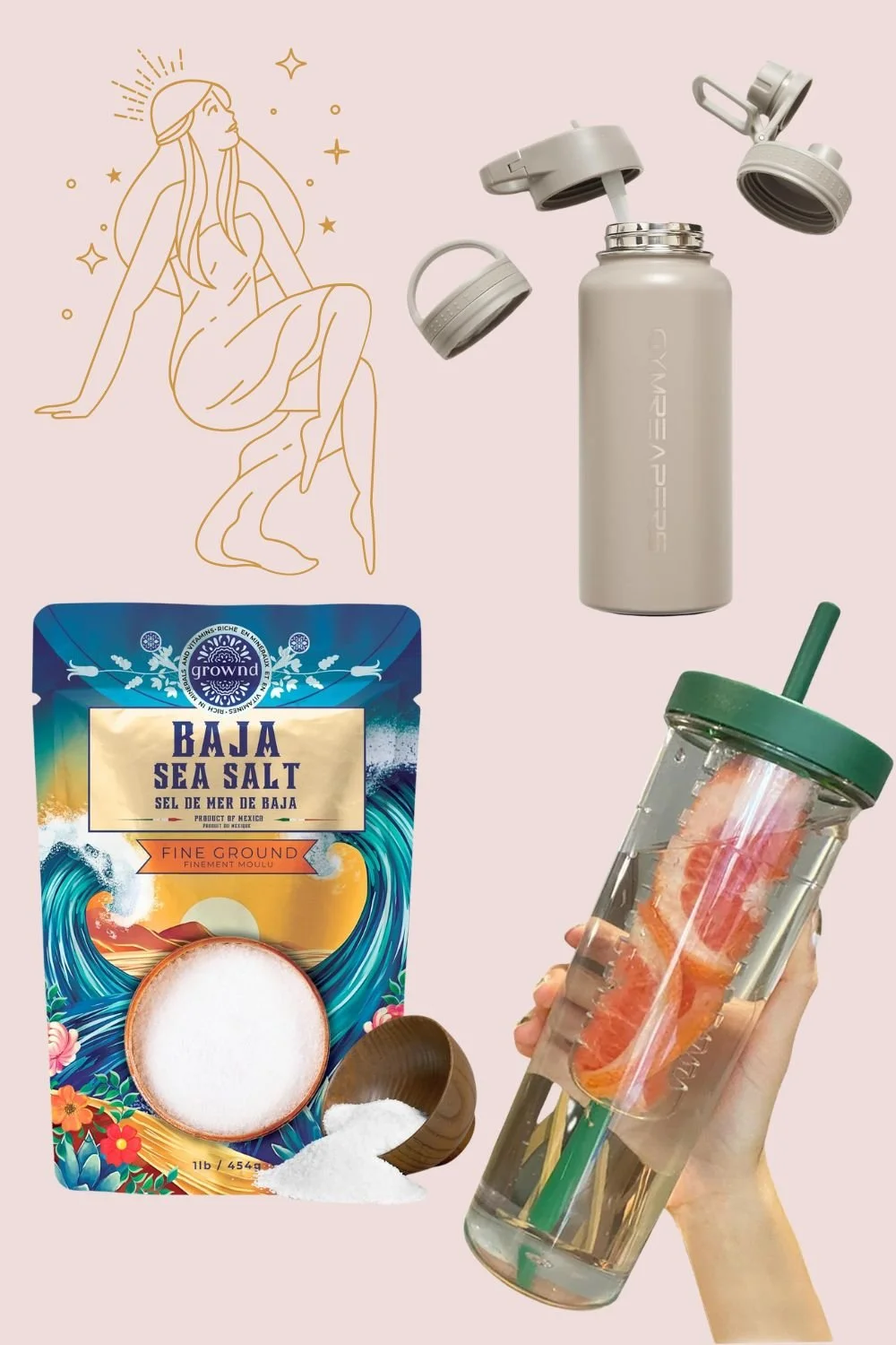 Tip: Place a small pinch of Baja salt in your mouth before your drink your water. The salt will help bring the water to your cells and plump and hydrate them. You will feel hydrated for longer.